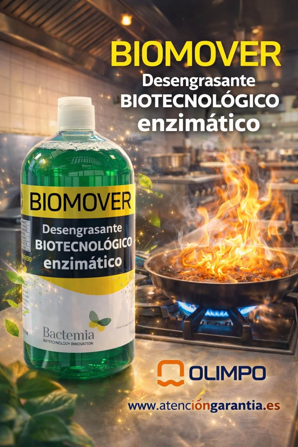 Biomover es un desengrasante biotecnológico enzimático formulado con enzimas activas que degradan la grasa desde el origen, sin dañar superficies ni dejar residuos agresivos.