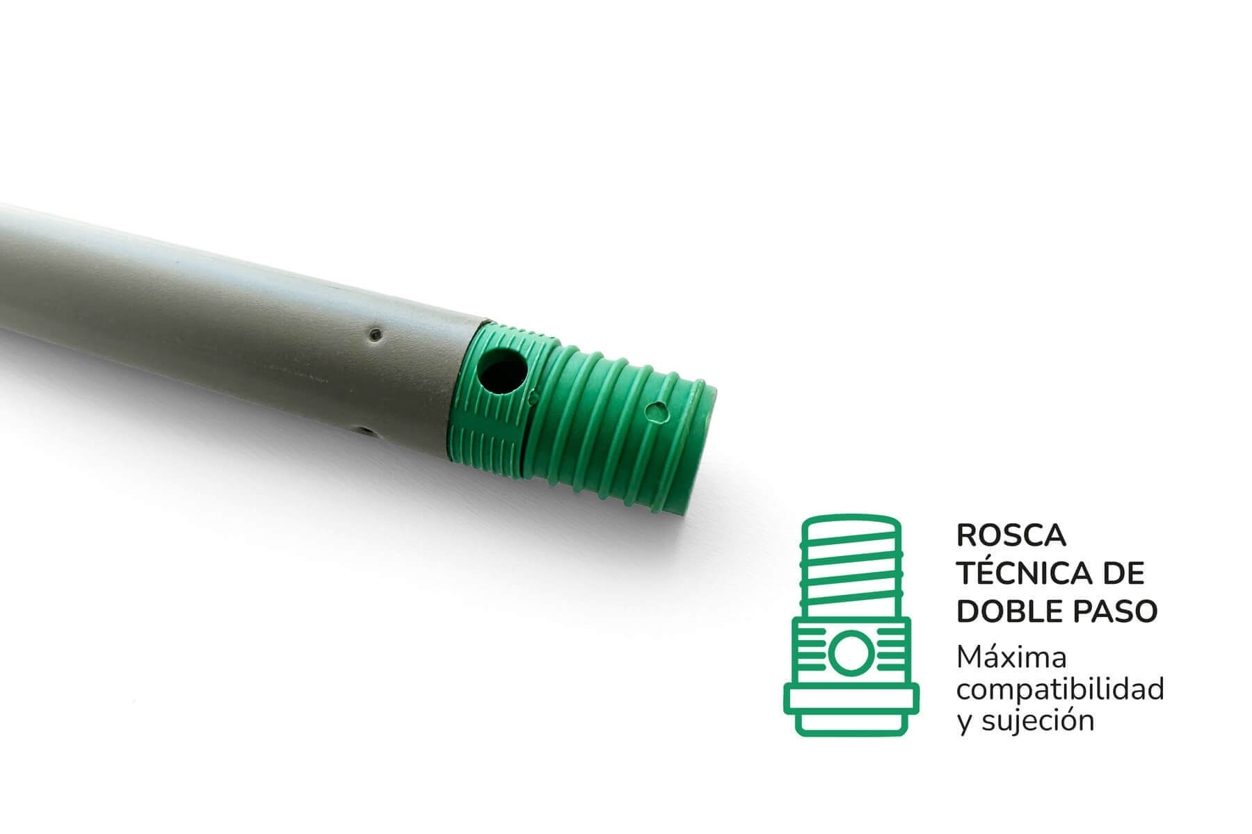 Incorpora rosca técnica de doble paso, que garantiza una fijación firme y estable con fregonas y útiles compatibles, evitando movimientos o aflojamientos durante el uso.