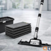 Este producto forma parte del sistema de fregado plano META, compuesto por soporte para mopa plana, recambios de mopa de microfibra, palo extensible profesional, cubeta para impregnación de mopas y tapa para cubeta (perforada o cerrada).