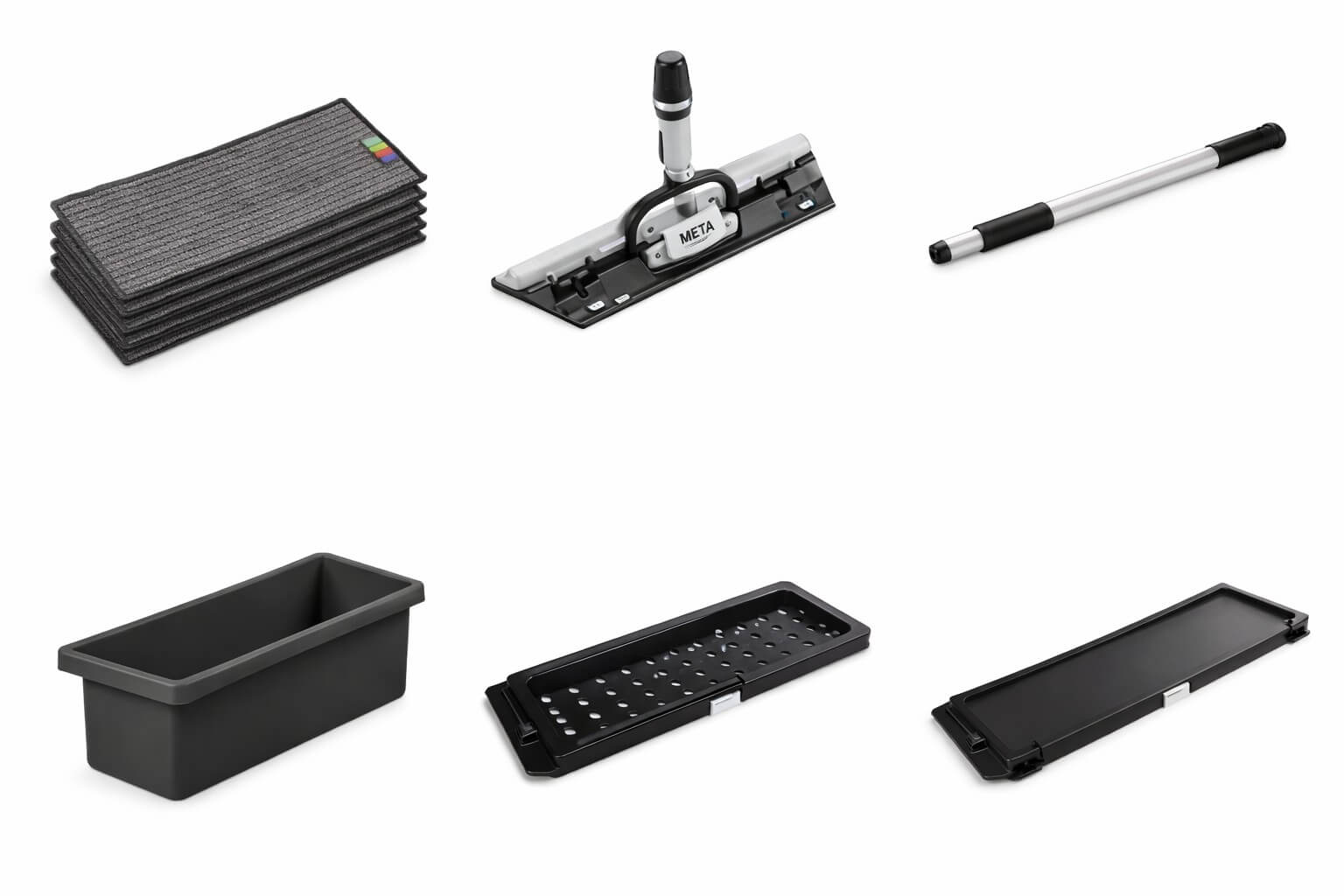 El sistema de fregado plano META está diseñado para optimizar la limpieza profesional mediante mopas previamente impregnadas con solución limpiadora.