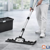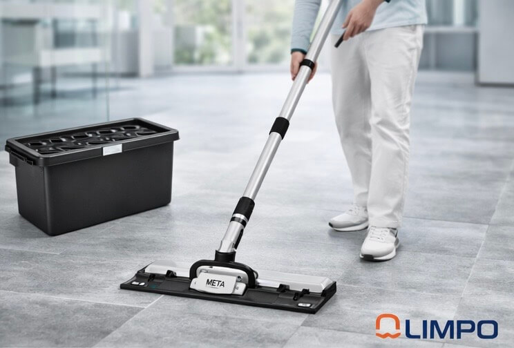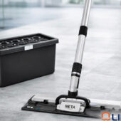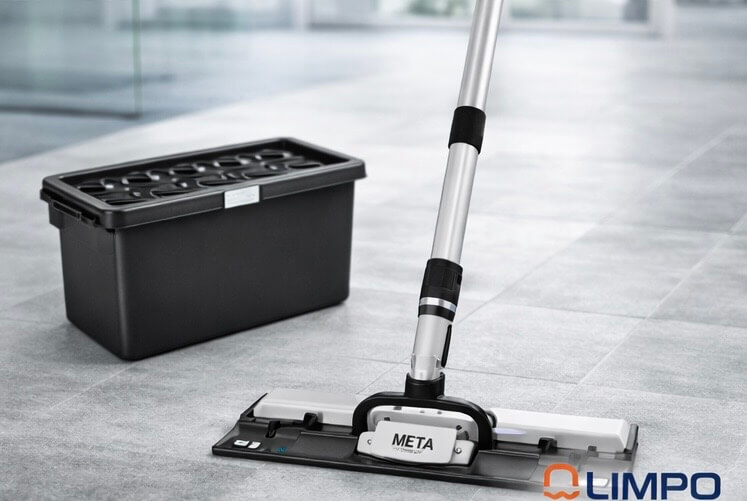 El soporte META para mopa plana es la base del sistema profesional de fregado plano META, diseñado para facilitar una limpieza rápida, ergonómica y eficaz.