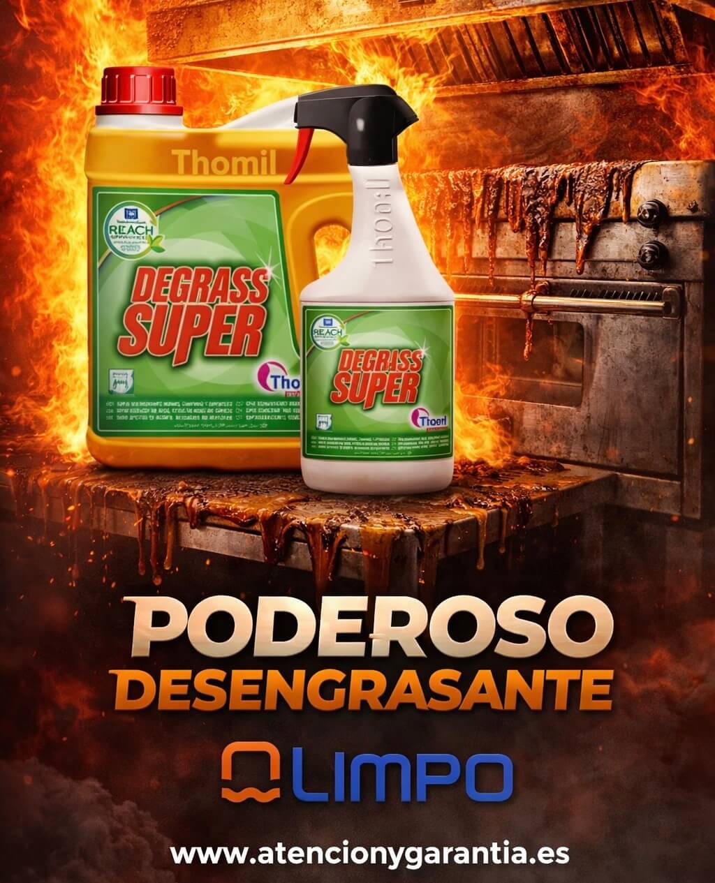 El Desengrasante Degrass Super de Thomil en formato de 4 litros es la solución definitiva para eliminar grasa incrustada y residuos difíciles en hornos, campanas extractoras y otras superficies. Su fórmula concentrada y de alto rendimiento está diseñada para descomponer rápidamente la grasa, facilitando la limpieza en cocinas industriales y domésticas.